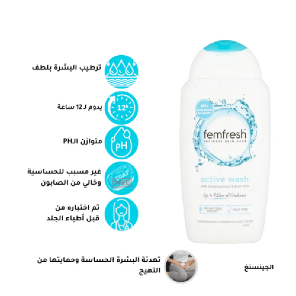 غسول فيم فريش متوازن في درجة الحموضة مشحون بتقنية أيونات الفضة، وخلاصة الجينسنغ، ومضادات الأكسدة لترطيب المنطقة الحميمية ويمنحك شعور بالانتعاش طوال اليوم، غسول منعش ومعطر غني بحمض اللاكتيك وزهرة الكالينديولا الملطفة التي تعطي إحساس فوري بالانتعاش، كما يحتوي على مركب "مالتي أكتيف" بأيونات الفضة والذي يزيل الرائحة مما يخلصك من الروائح الكريهة.