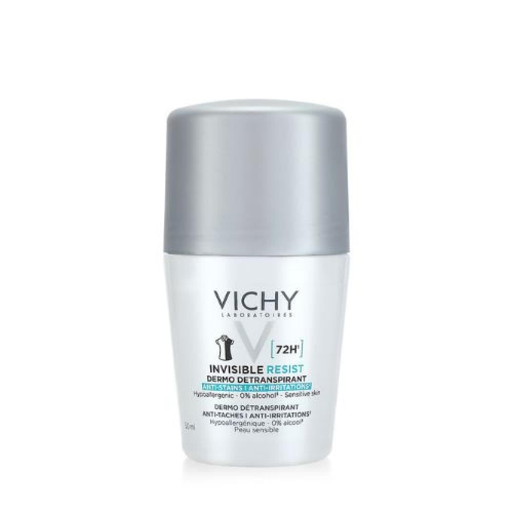 مزيل عرق فيشي Invisible Resist 72H Roll-On 50 مل هو مزيل عرق مضاد للتعرق ومضاد للبقع والتهيج.