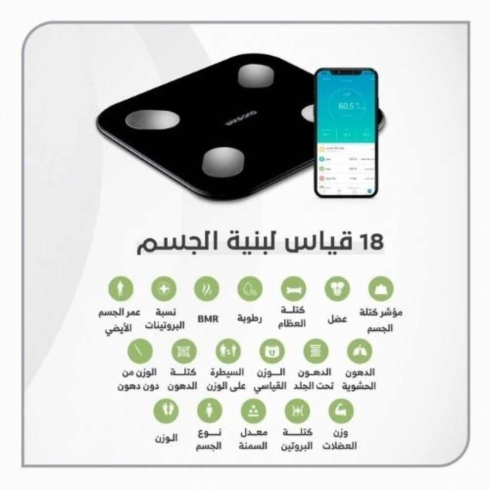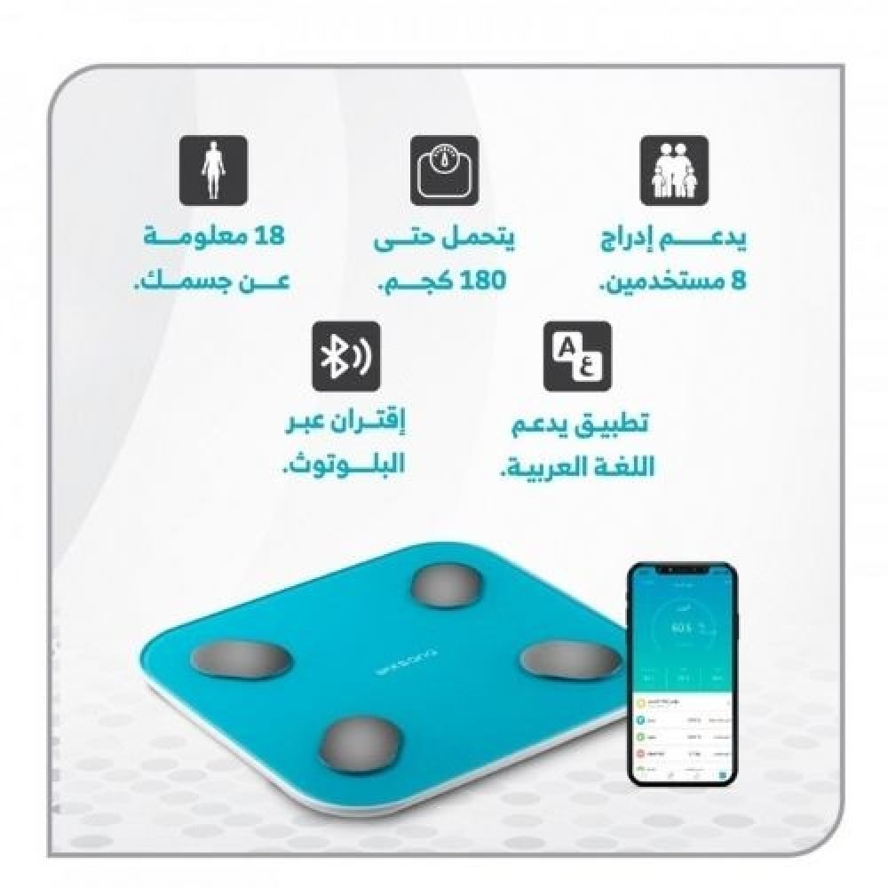 الميزان الذكي من ويكسانا مزود بأجهزة استشعار عالية الدقة لتعطيك قراءة تحليلية لـ 18 مؤشر قياس لبنية الجسم , ببساطة ميزان ويكسانا الطريقة الأسهل لك ولعائلتك لتبقى على اطلاع دائم على تغيرات قياسات بنية الجسم بطريقة سهلة وذكية من خلال الارتباط بهاتفك الجوال.