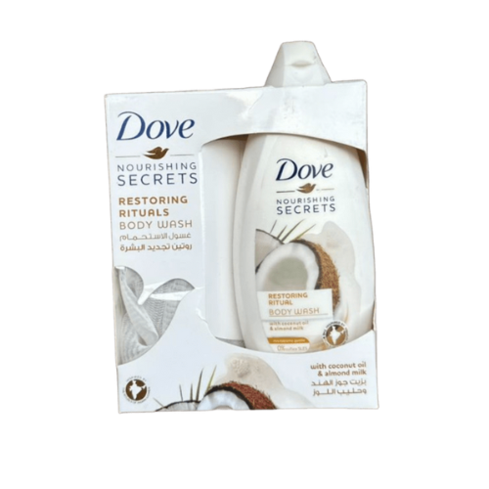 يُمكنك الآن الحصول على دوف غسول استحمام بزيت جوز الهند وحليب اللوز مع ليفة 250 مل والحصول على بشرة ناعمة باستخدام أفضل سائل استحمام برائحة تدوم لفترة طويلة.