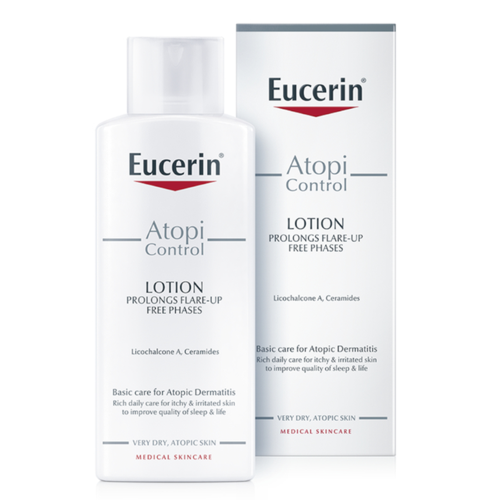 يستخدم لوشن العناية بالجسم Eucerin AtopiControl Body Care Lotion مزيجاً من الأحماض الدهنية Omega 6 المركزة (زيت زهرة الربيع المسائية و زيت بذور العنب) بالإضافة إلى الملطف (مستخرج من جذور عرق السوس) لسد النقص في البشرة، مما يساعدها على اصلاح حاجز الحماية الطبيعي و جعلها أكثر مرونة يوضع مرة أو مرتين يومياً او كعناية إضافية لكريم العناية خلال النوبة الجلدية. مع الإستخدام المنتظم يتم التخلص من الحكة و الشد و تصبح البشرة ناعمة و رقيقة الملمس بشكل ملحوظ أثبت سريرياً و جلدياً توافق لوشن العناية بالجسم مع البشرة الأتوبية عند البالغين و الأطفال و الرضع من عمر 3 أشهر. هذه التركيبة المائية-الزيتية خالية من العطور و الملونات و البارابين و ذلك لتخفيف خطر التهيج و الحساسية يوضع مرة أو مرتين يومياً أو حسب الحاجة