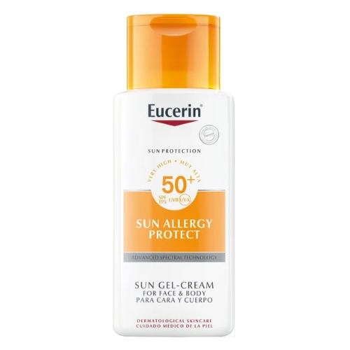 كريم جل الحماية من الشمس Eucerin Sun Protection Gel Cream SPF50 + Sun Allergy Protect هو واقي من الشمس للوجه والجسم ، مصمم خصيصًا للبشرة الحساسة للشمس والبشرة المعرضة لحساسية الشمس مثل الطفح الضوئي متعدد الأشكال (PLE).