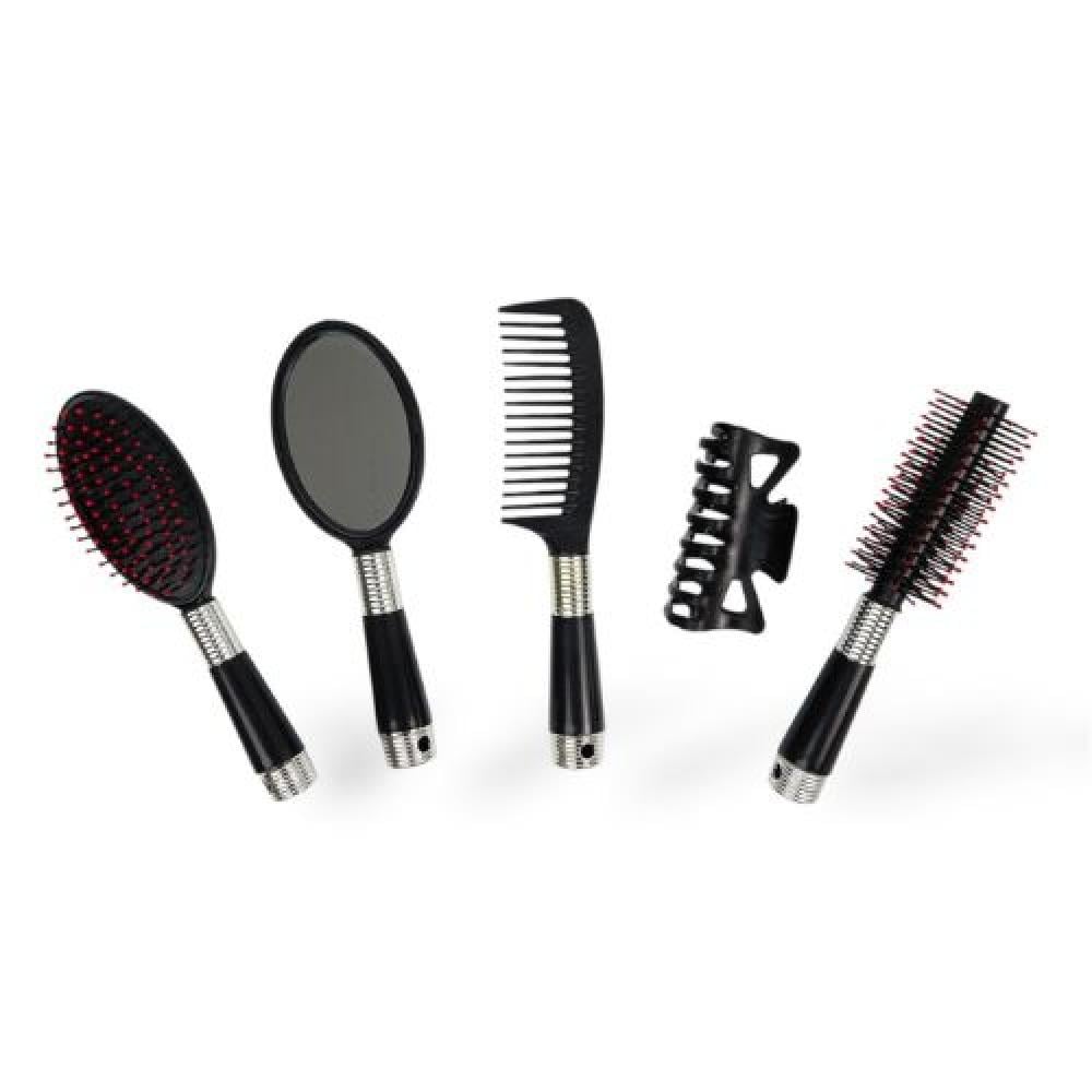 • 5 قطع أساسية: تشمل (فرشاة بيضاوية، مرآة يدوية، مشط، فرشاة أسطوانية، ومشبك).