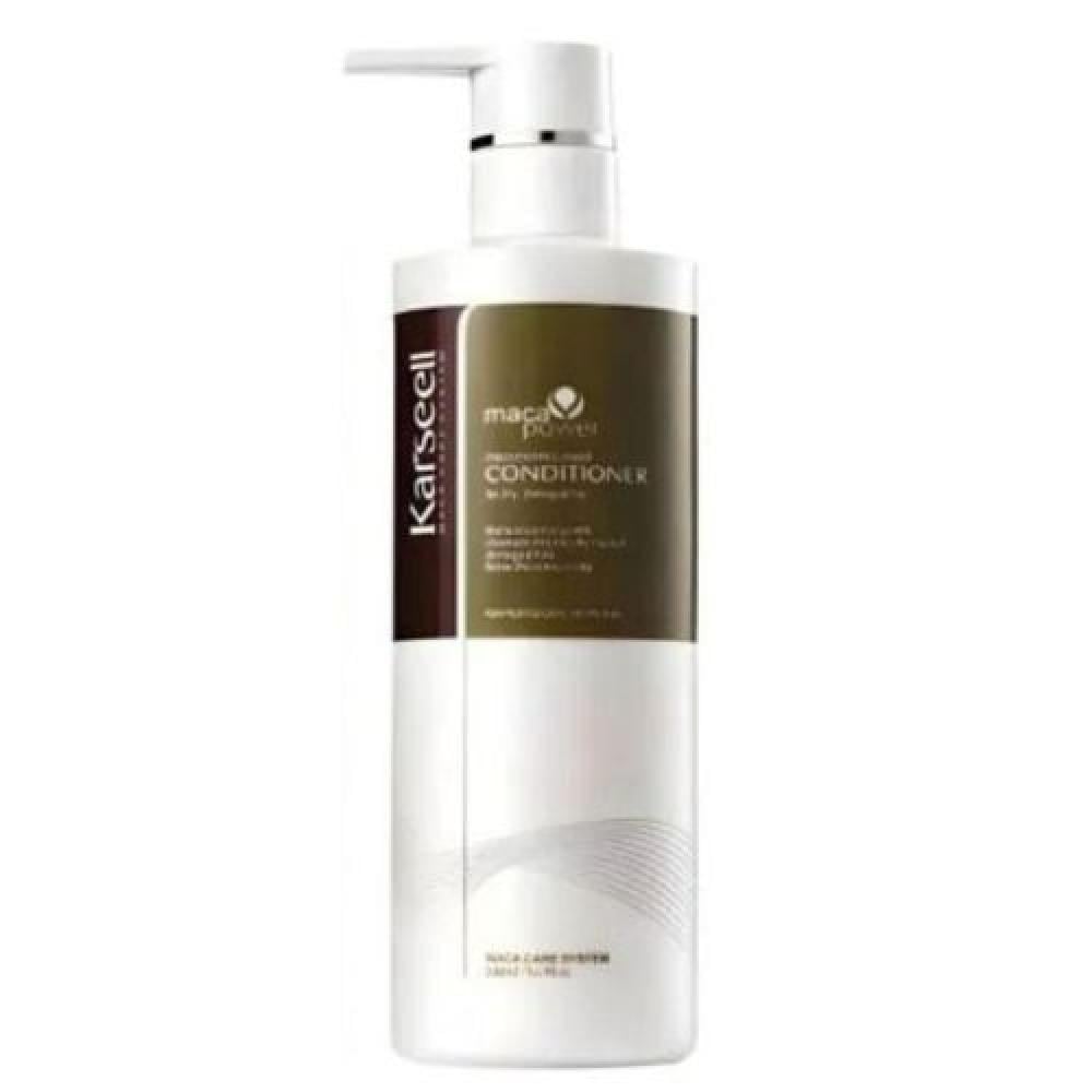 زجاجة كارسيل ماجيك باور (Karscell Magic Power) بلسم الشعر تظهر تصميمًا أنيقًا ومهنيًا، يتميز بعبوة بيضاء اللون مع مضخة في الأعلى. تحتوي الزجاجة على ملصق رسومي مكتوب عليه نص بالألوان الذهبية والسوداء والبيضاء، مع التركيز على الكلمات "ماجيك باور" و"بلسم"، ما يشير إلى استخدامه للعناية بالشعر.