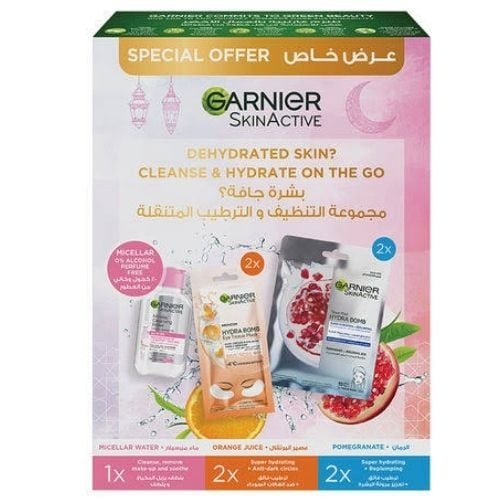 مجموعة التنظيف والترطيب المتنقلة سكين أكتف من غارنييه متعدد الألوان (100 مل ماء ميسلار+2ماسك للوجه+2ماسك للعين)