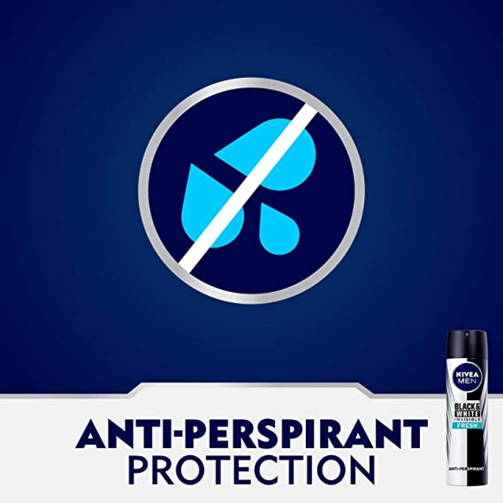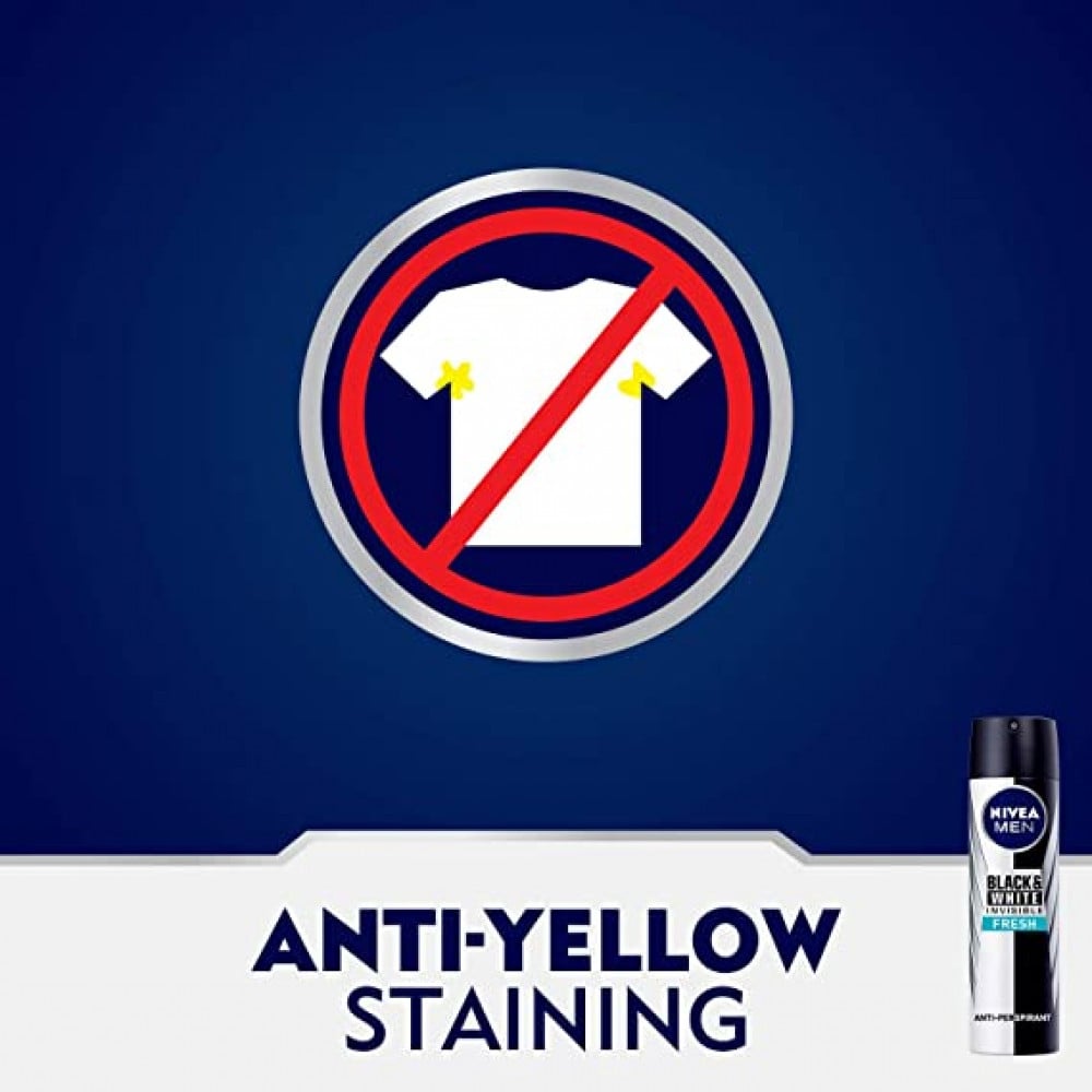 نيفيا بخاخ مقاوم للتعرق والبقع أنفيزابل بلك أند وايت فرش للرجال 150 ملحماية الملابس بالأبيض والأسود حفظ ملابسهم بيضاء لفترة أطول48h حماية فعالة مضاد للعرق لا يترك أي علامات بيضاء على بشرتك أو ملابسك تركيبة مثالية توفر حماية موثوفة كتلك التي يوفرها مزيل العرق ورعاية نيفيا منتج معتمد من أطباء الجلدية يساعد على منع تراكم البقع الصفراء على الملابس البيضاء