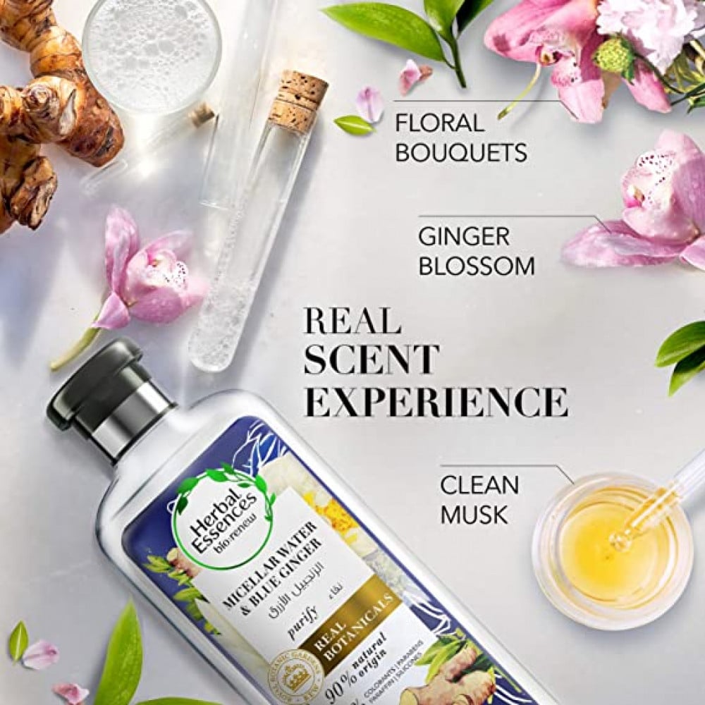 شامبو هربل إسنسز بماء ميسلر والزنجبيل الأزرق يمنحك شعوراً مميزاً بالنظافة والانتعاش.
