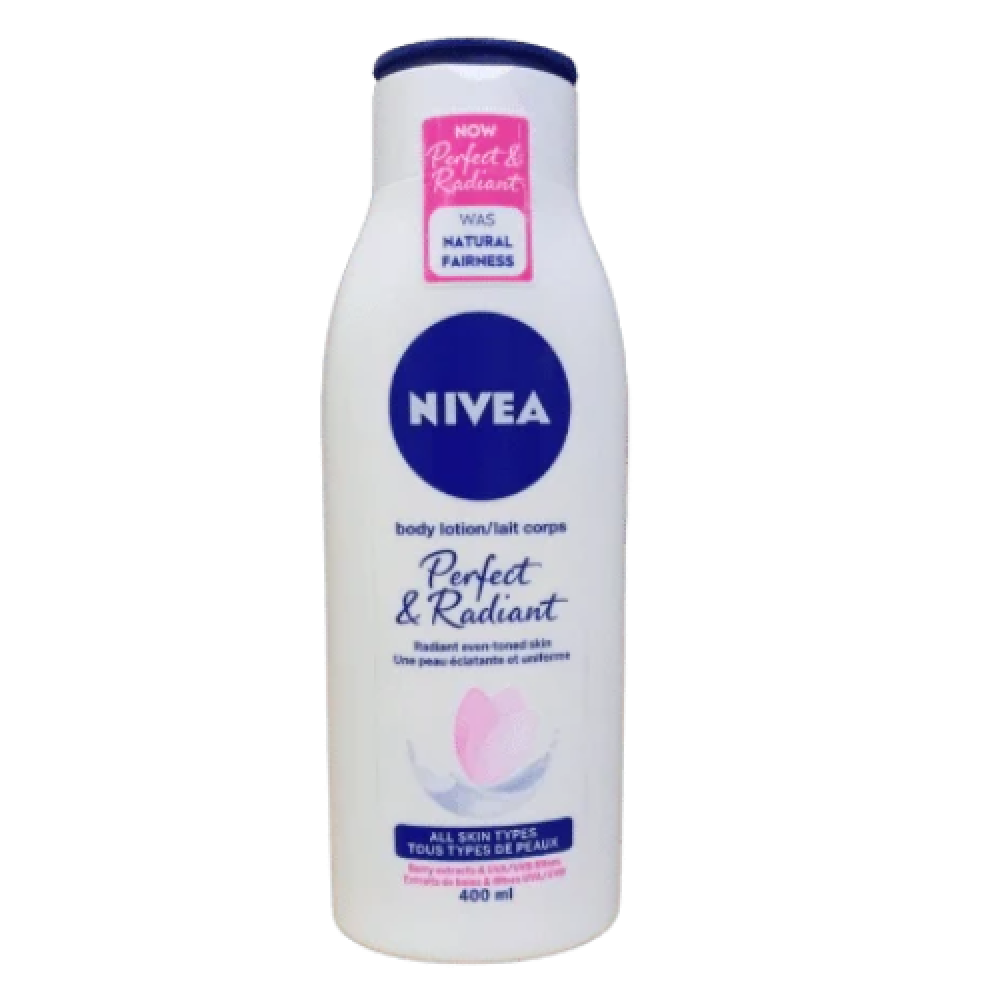 لوشن الجسم Nivea Perfect & Radiant مناسب لجميع أنواع البشرة ، بما في ذلك البشرة الحساسة. كما أنه غير دهني ويمتص الجلد بسرعة.